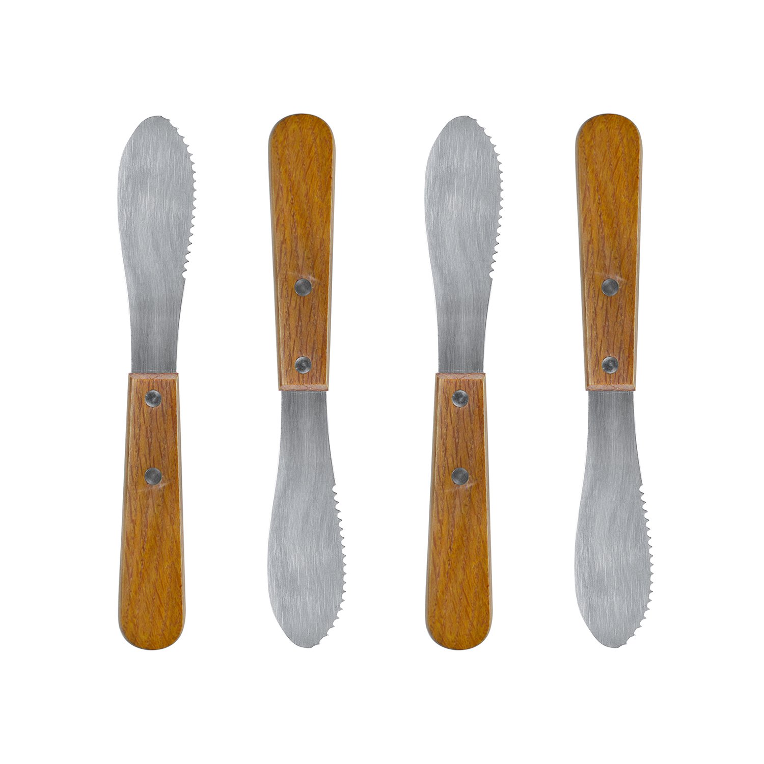 • The Stainless Steel Straight Edge Butter Cheese Cream Sandwich Condiment Spreader Knives with Wood Handle for Kitchen Tools, Cooking Utensil, Event Guest Serving (4 Pack) by Super Z Outlet® is a