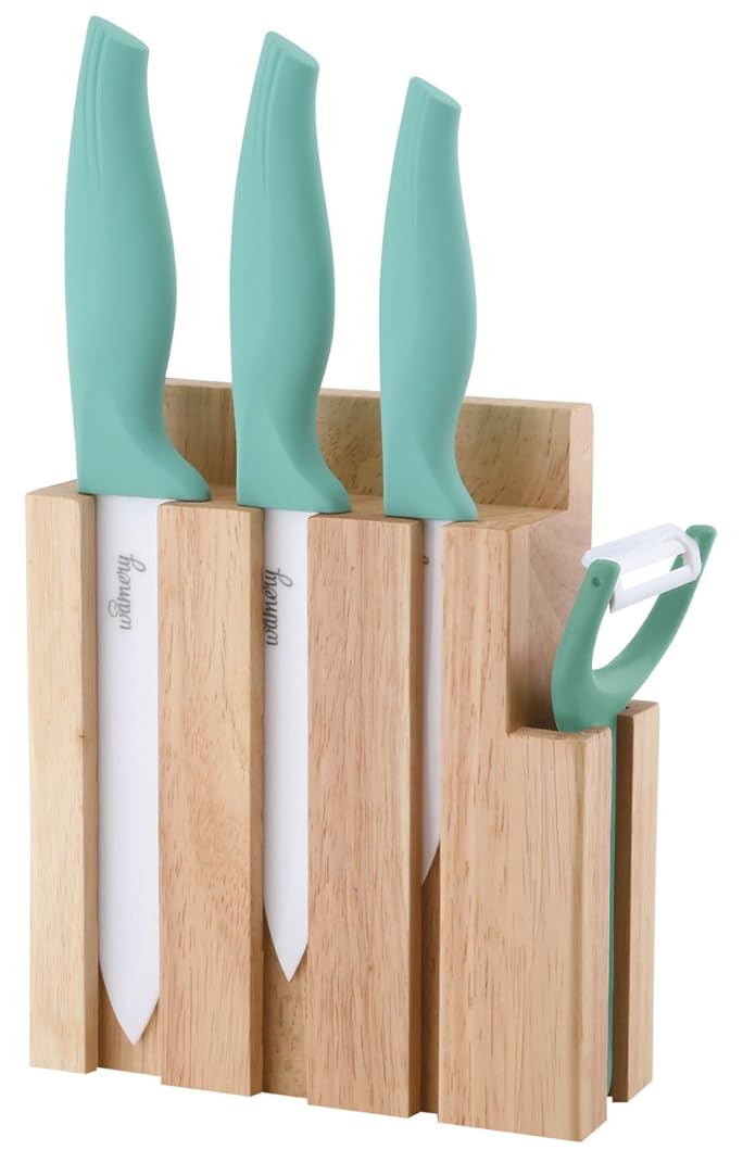 Handle with care Sometimes the finer tools require more delicate care.Despite its hardness our Chef Knife is fragile and should be handled with care.Instructions on how to properly care for the knife are provided.- Easy enough to rinse clean under water within a few seconds.- Packing a durable sheath to prevent accidents from happening.- Well-balanced when you're holding it in your hand.- Unable to leave a bad taste or smell on anything it touches.- Capable of saving you time by staying really sharp for years.Ceramic Knife Set and Peeler in Solid Wood Holder. 6, 5 and 4 Inches White Sharp Blades. Professional Chef Utensil for Kitchen. Effortlessly Cut and Slice. Zirconium Resistant. Antibacterial. FDA is best for youColor:Wood Block + Turquoise Enjoy a High Quality Ceramic Knife set made of a fashion turquoise color (Pantone 565 U). The white blade is made of ultra-hard Zirconium dioxide. Only diamonds are harder. It will stay sharp 15x times more than steel. Key features: Ultra lightweight knives for precise cuts No Sticky Naturally germ and bacteria resistant Long lasting and easy to clean Unique design, perfect fit High quality product Never Rust. No browning or oxidization of food The box you are ordering includes: (1) 4' Paring Ceramic Knife (1) 5' Paring Ceramic Knife (1) 6' Utility Ceramic Knife (1) Ceramic Peeler (1) Solid Oak block holder to keep them safe and dry to last longer From the Manufacturer : We believe that the family is the centerpiece of the society and the kitchen the home’s soul. We want to encourage anyone who is looking for a healthier lifestyle to by providing high quality kitchen product. Focused on the customer service you will receive the User’s Manual by email as soon as you set this order today. This special price is for a limited time. Wamery is 100% SATISFACTION OR MONEY BACK GUARANTEE. Buy it now, it is risk free!