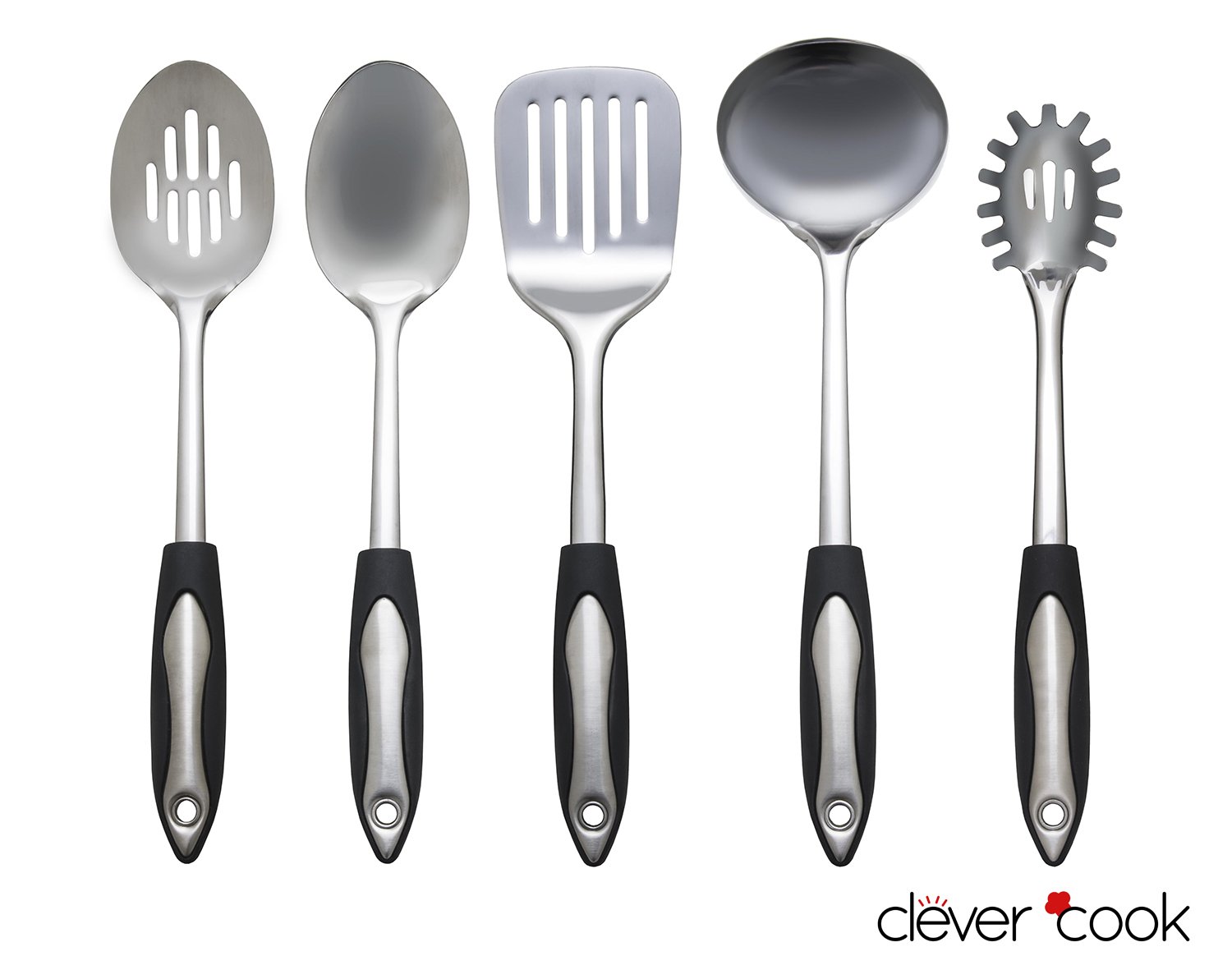 • The Clever Cook 5 Piece Stainless Steel Starter Set of Kitchen Utensils for Cooking and Serving is a