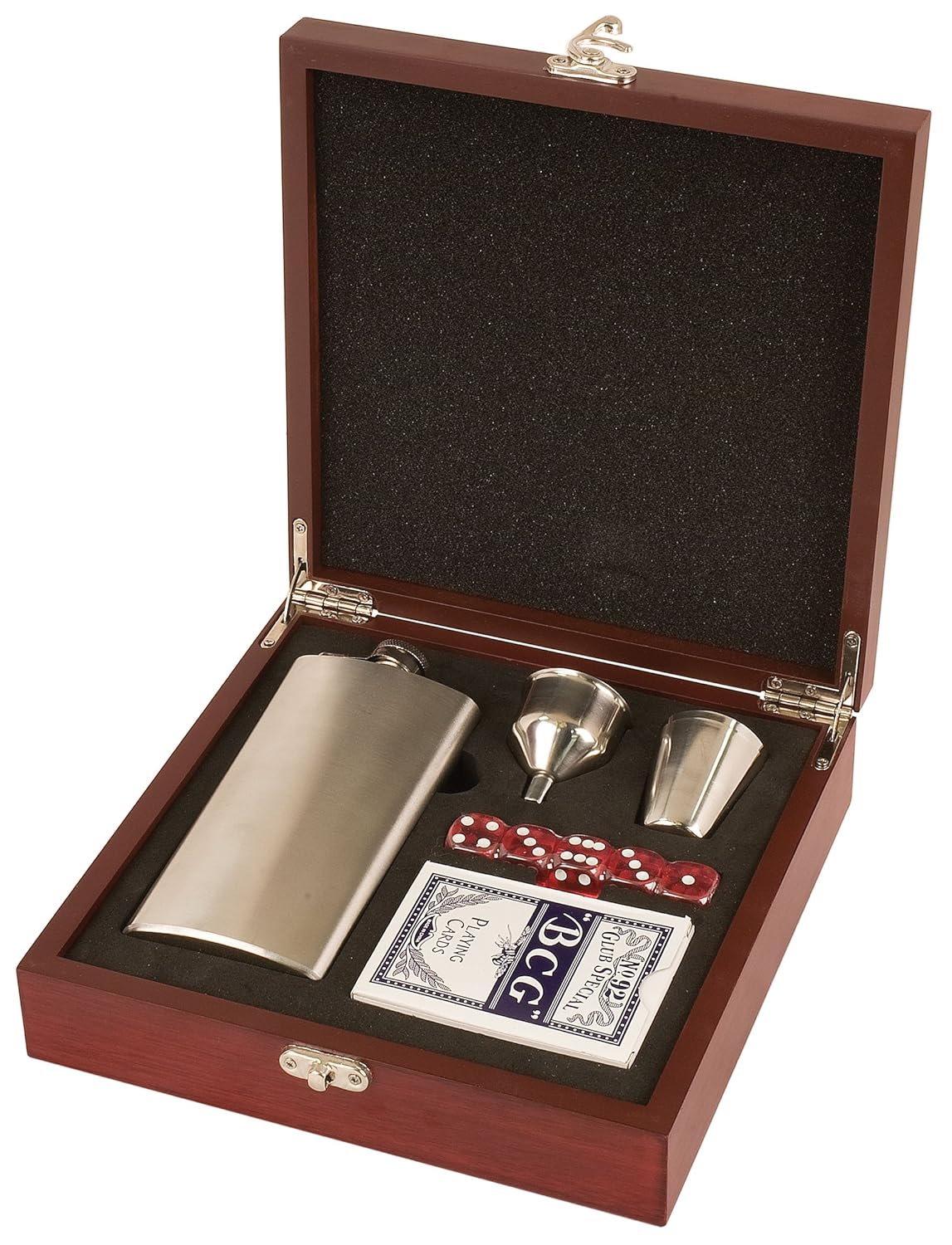 Handle with care Sometimes the finer tools require more delicate care.Despite its hardness our Chef Knife is fragile and should be handled with care.Instructions on how to properly care for the knife are provided.- Easy enough to rinse clean under water within a few seconds.- Packing a durable sheath to prevent accidents from happening.- Well-balanced when you're holding it in your hand.- Unable to leave a bad taste or smell on anything it touches.- Capable of saving you time by staying really sharp for years.Rosewood Finish Flask Gift Set is best for youThis Rosewood finished wood box contains a metal flask, funnel and metal shot glass along with a deck of cards and 5 dice. Makes a super gift for an executive or anyone who travels