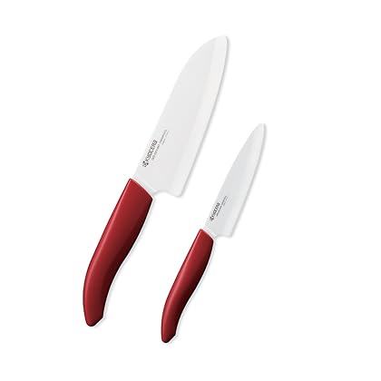 Handle with care Sometimes the finer tools require more delicate care.Despite its hardness our Chef Knife is fragile and should be handled with care.Instructions on how to properly care for the knife are provided.- Easy enough to rinse clean under water within a few seconds.- Packing a durable sheath to prevent accidents from happening.- Well-balanced when you're holding it in your hand.- Unable to leave a bad taste or smell on anything it touches.- Capable of saving you time by staying really sharp for years.Kyocera Advanced Ceramic Revolution Series 2-Piece Cultery Gift Set, Includes 5.5-inch Santoku and 4.5-inch Utility Knife, White Blade with Red Handle is best for youStyle Name:2-Piece Ceramic Cultery Set, Red This practical and beautiful set features two of our best-selling ceramic knives: A 5.5 inch Santoku and a 4.5 inch utility knife, in popular holiday gift color: red. This set is perfect for the home cook; these knives will be used daily, quickly becoming favorites in the kitchen. Use the Santoku knife for slicing, dicing, mincing, julienning and the utility knife for cutting, trimming, seeding and peeling small fruits and vegetables. Packaged in an acetate hanging box for easy display purposes. Part of the Revolution series, Kyocera's most popular line, these knives feature ultra-sharp ceramic blades as well as a deeper profile for greater knuckle clearance. And unlike steel blades, ceramic blades will never rust or change from its natural state. Comfortable, ergonomic resin handles provide precise control, while their distinctive shape makes it both easy to find and easy to use. Kyocera advanced ceramic kitchen knives, which are impervious to acids, juices, oils and salts, leave no metallic taste or odor, and help maintain the freshness of fruit and vegetables. The razor-sharp blade retains its original sharpness 10 times longer than steel knives. And because the ceramic blade is so light, no artificial weight is added to the handle. This creates an extremely balanced, lightweight tool that reduces fatigue during repetitive cutting tasks. Kyocera knives are made in Japan, and they should only be washed by hand. Use on a wood or plastic cutting board. Lifetime Warranty: Kyocera advanced ceramic cutlery and kitchen tools are fully warranted to be free of defects in material and/or craftsmanship. If your knife is chipped or damaged, Kyocera Industrial Ceramics will repair or replace. Lifetime Complementary Sharpening: Kyocera offers complimentary sharpening for KYOCERA ADVANCED CERAMIC knives only. A shipping and handling charge is required per shipment. Up to two (2) knives - $10; $5 for each additional knife. If purchased separately $79.95 a savings of $20.00.
