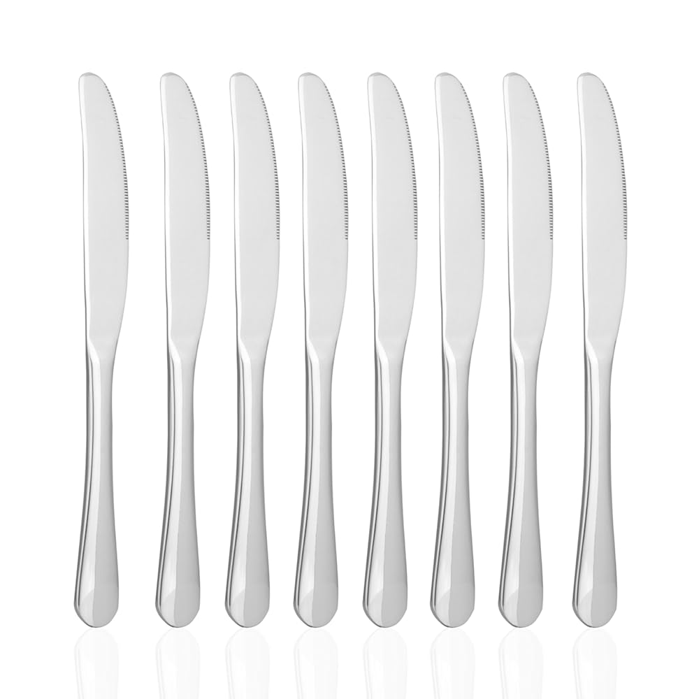 Handle with care Sometimes the finer tools require more delicate care.Despite its hardness our Chef Knife is fragile and should be handled with care.Instructions on how to properly care for the knife are provided.- Easy enough to rinse clean under water within a few seconds.- Packing a durable sheath to prevent accidents from happening.- Well-balanced when you're holding it in your hand.- Unable to leave a bad taste or smell on anything it touches.- Capable of saving you time by staying really sharp for years.MIUCOLOR Dinner Steak Knife Set - Stainless Steel Knife 8-Piece is best for youColor:Dinner Knife, 8 Set MIU COLOR is a contemporary home décor and furnishing brand founded in San Jose in 2009. Under the theme of “Simplicity”, we are dedicated to design and create products that are simple, easy to use, and eco-friendly for people who value quality, natural, and balanced life experiences, no matter at home, at work, or outdoors. MIU COLOR products range from home décor, office supplies, kitchen appliances, to travel accessories, and we will continue to improve the design, materials and functionality of our products. Product Description: Brand: MIU COLOR Material: High quality polished stainless steel Package included: 8-piece dinner knife Product dimensions: Total length: 9cm (3.5 in) Features: 1. Made of high quality polished stainless steel, ensure you a good mood at table. 2. Excellent choice of flatware for home, any restaurant or bar, beautiful and fashionable design, will be a good gift for friends who love cooking as well. 3. Multiple choices for products and quantity, meet all your requirements. 4. Dishwasher safe, hand washing is recommended for best results.