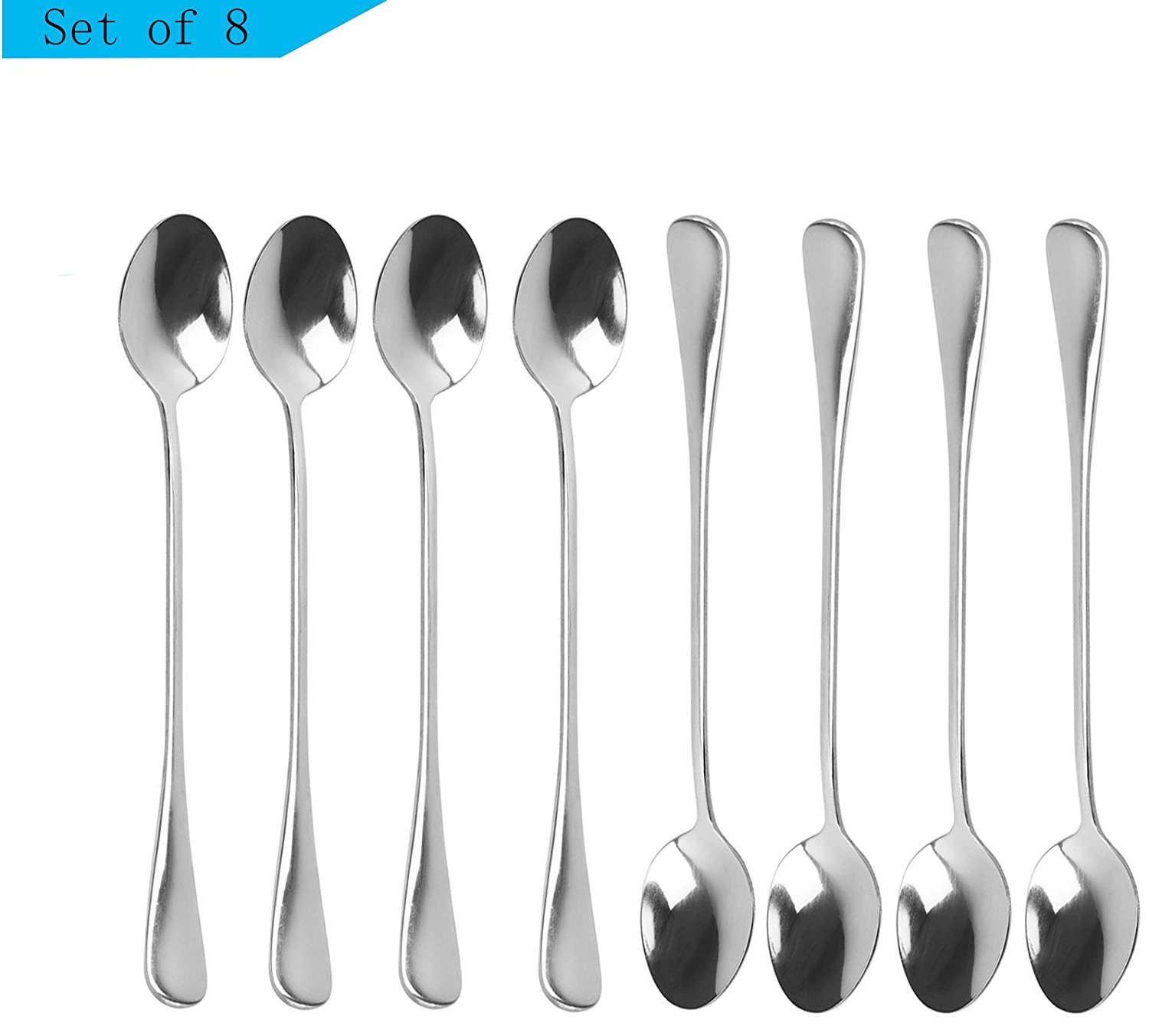 • The NNYCo Stainless Steel Long Handle Ice Cream Spoon for Tea, Coffee, Smoothies, Set of 8 is a