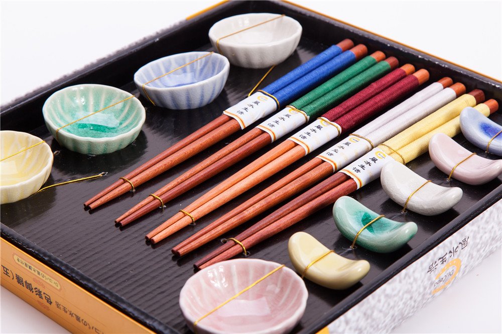 Why Use 15 Pcs Set Of 5 Pairs Natural Wood Chopsticks, 5 Ceramic holders and 5 Saucers In Various Colors, Gift Box ?