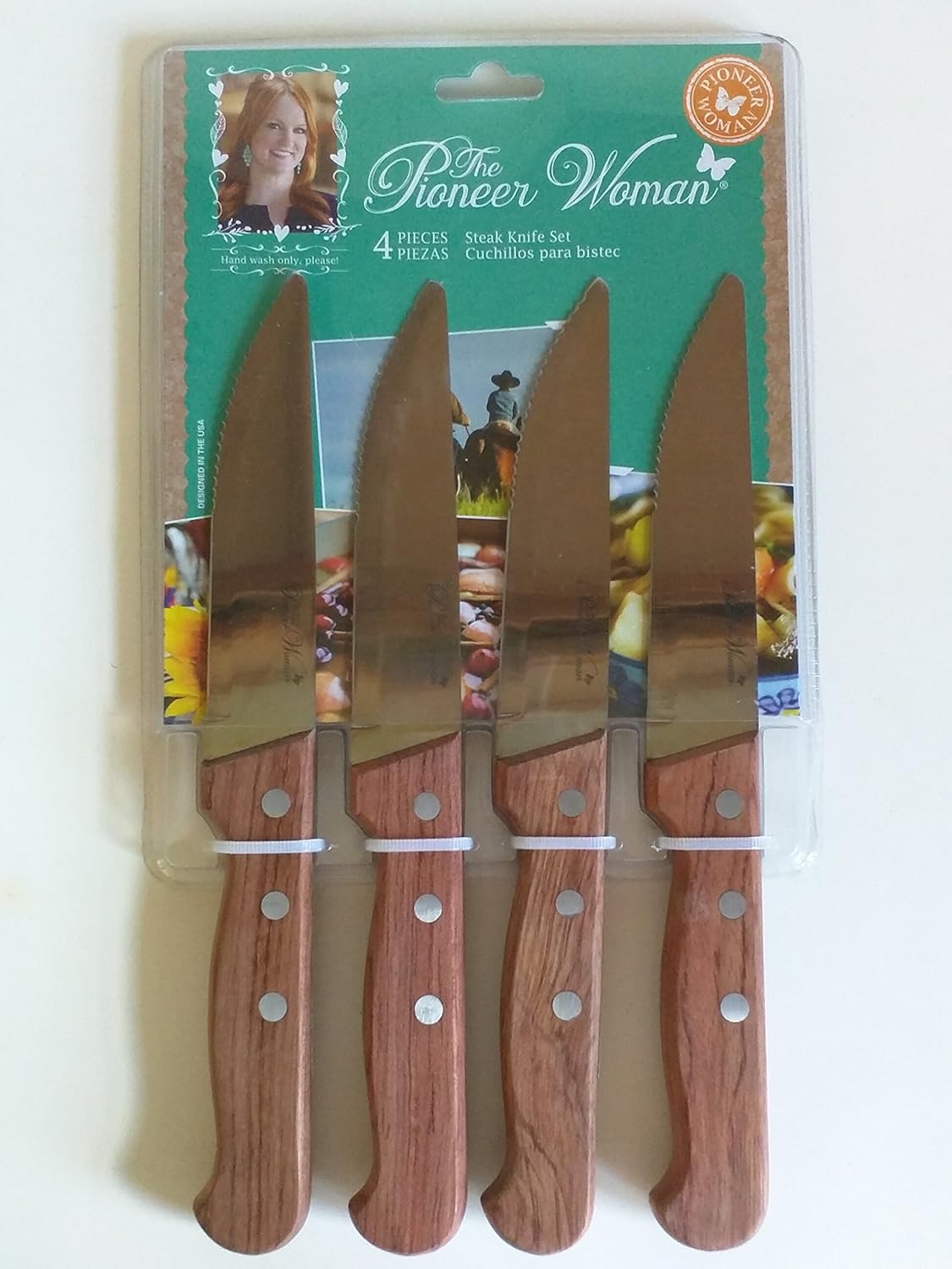 • The The Pioneer Woman 4 Piece Steak Knife Set with Rosewood Handles is a