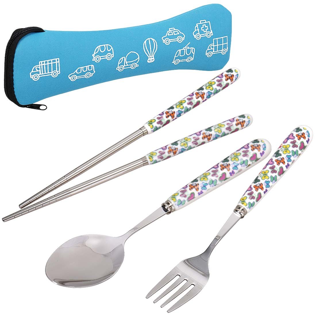 • The Ava & Kings 3 pc Fork Spoon Chopstick in Neoprene Case Travel Utensils - Set 4: Butterflies is a