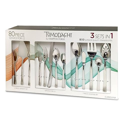 Handle with care Sometimes the finer tools require more delicate care.Despite its hardness our Chef Knife is fragile and should be handled with care.Instructions on how to properly care for the knife are provided.- Easy enough to rinse clean under water within a few seconds.- Packing a durable sheath to prevent accidents from happening.- Well-balanced when you're holding it in your hand.- Unable to leave a bad taste or smell on anything it touches.- Capable of saving you time by staying really sharp for years.Tomodachi Carolina 80-Piece Flatware Set is best for youDine in style with the Tomodachi Carolina flatware by Hampton Forge. The exquisitely hammered texture with mirror polish finish reflects the light to create a dramatic statement on your table setting. This 80-piece set includes 12 flatware place settings, as well as 8 hostess serving pieces.